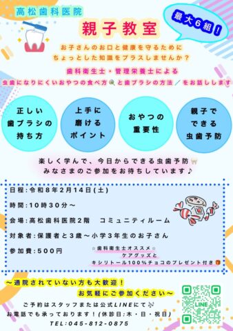 高松歯科医院では、2月14日(土)に毎回大好評な親子教室を開催いたします(最大6組)。